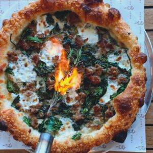 You know when you are at a Mexican restaurant and the fajitas come out sizzling and everyoneโs head turns? Also, that sizzle lights a little fire in your stomach and says, โletโs eat!โ That is what my intention is with this pizza. It is delicious on its own. However, torching the rosemary and filling the dining room air with that delicious smell is all an attempt to get you ready to eat.